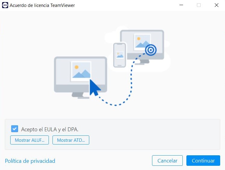 Para descargarla, acceda a TeamViewer comenzará a bajarse el archivo ejecutable (TeamViewerQS.exe), una vez completado, ejecute el archivo, acepte los términos y Continuar.